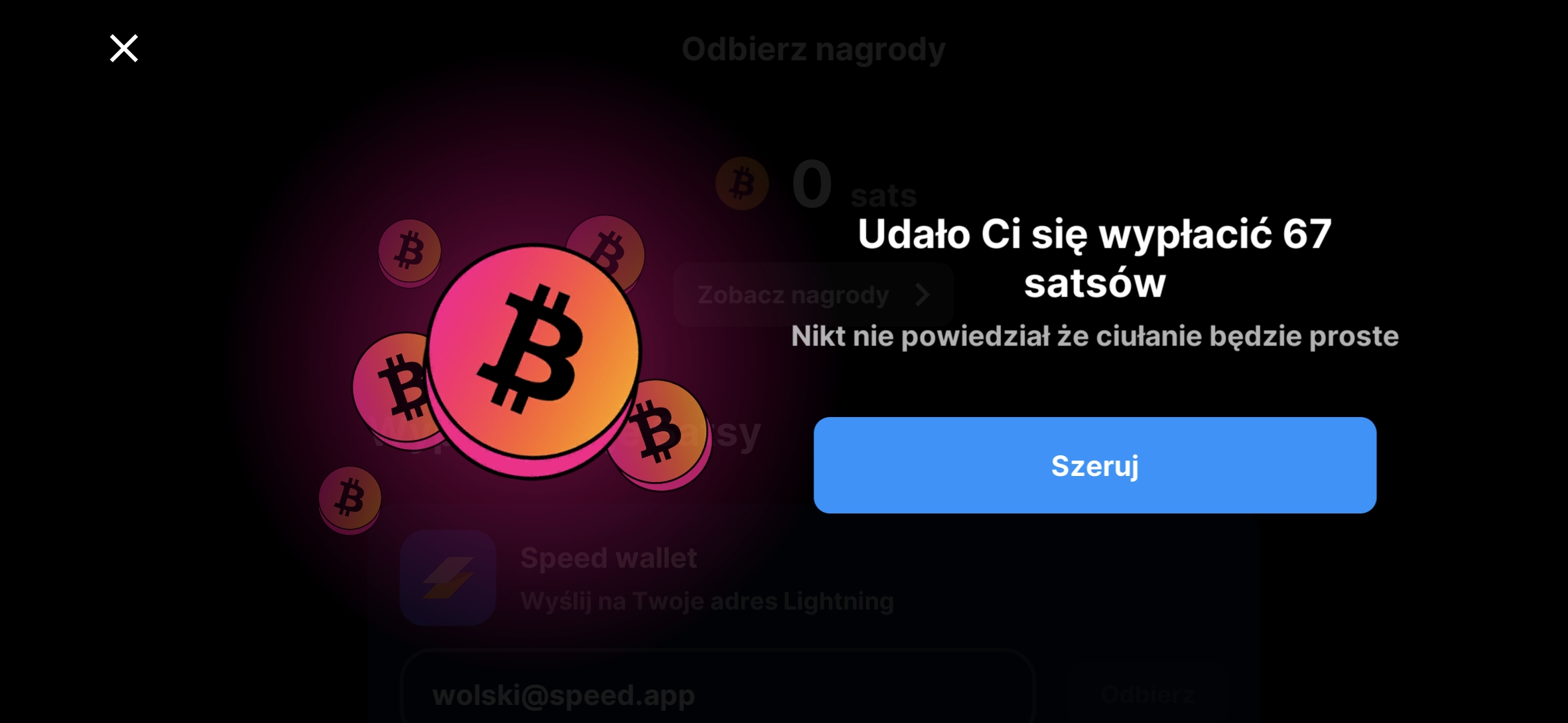 Wypłata Satoshi jest bardzo prosta i można ją zrealizować już od 1 Satoshi. To bardzo ważne, wiele gier informuje o progu wypłaty. Tutaj mamy wypłatę na żądanie. Po połączeniu portfela Speed Wallet, możesz otrzymać swoje Satoshi, praktycznie natychmiast po zleceniu wypłaty.